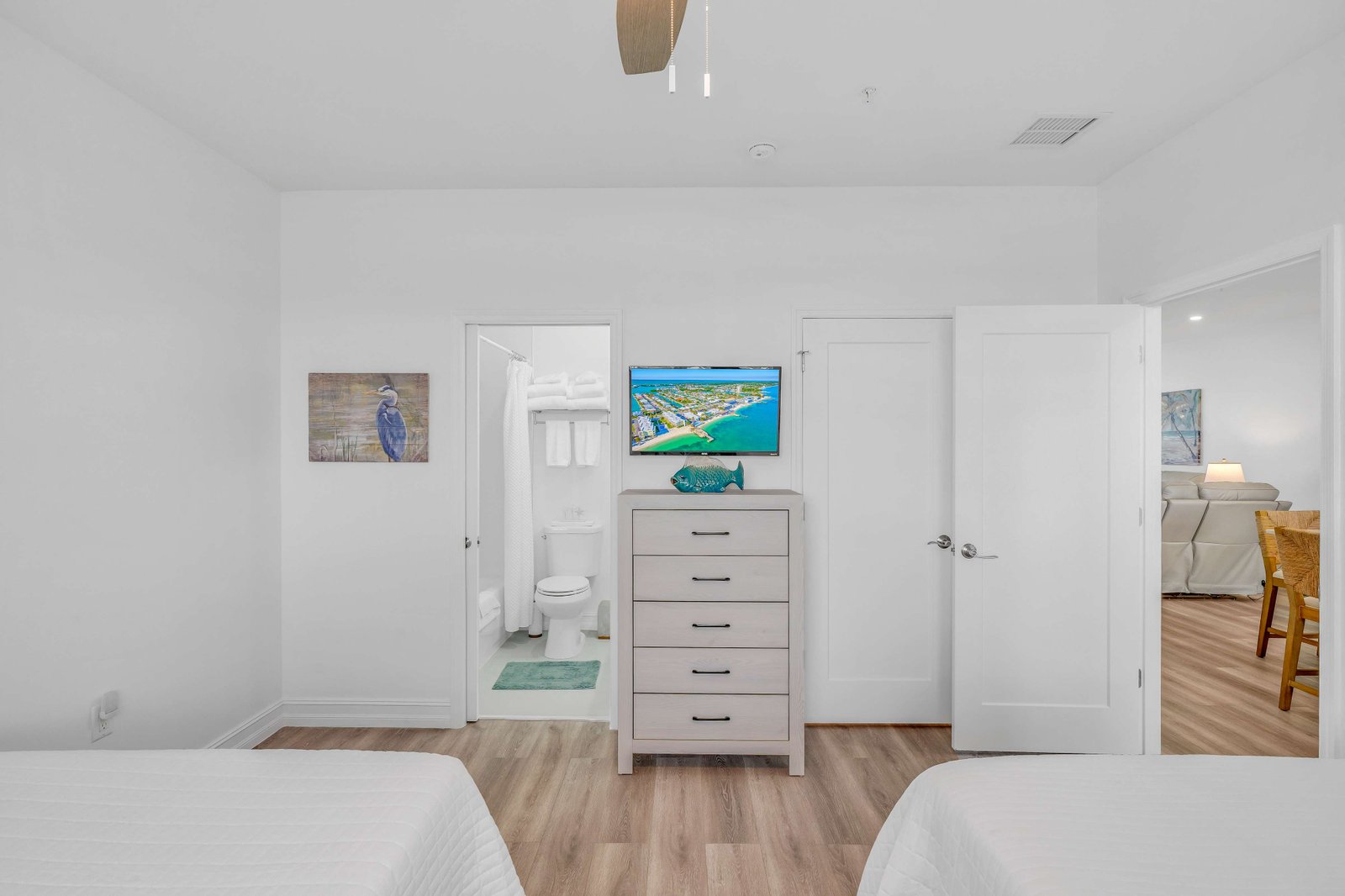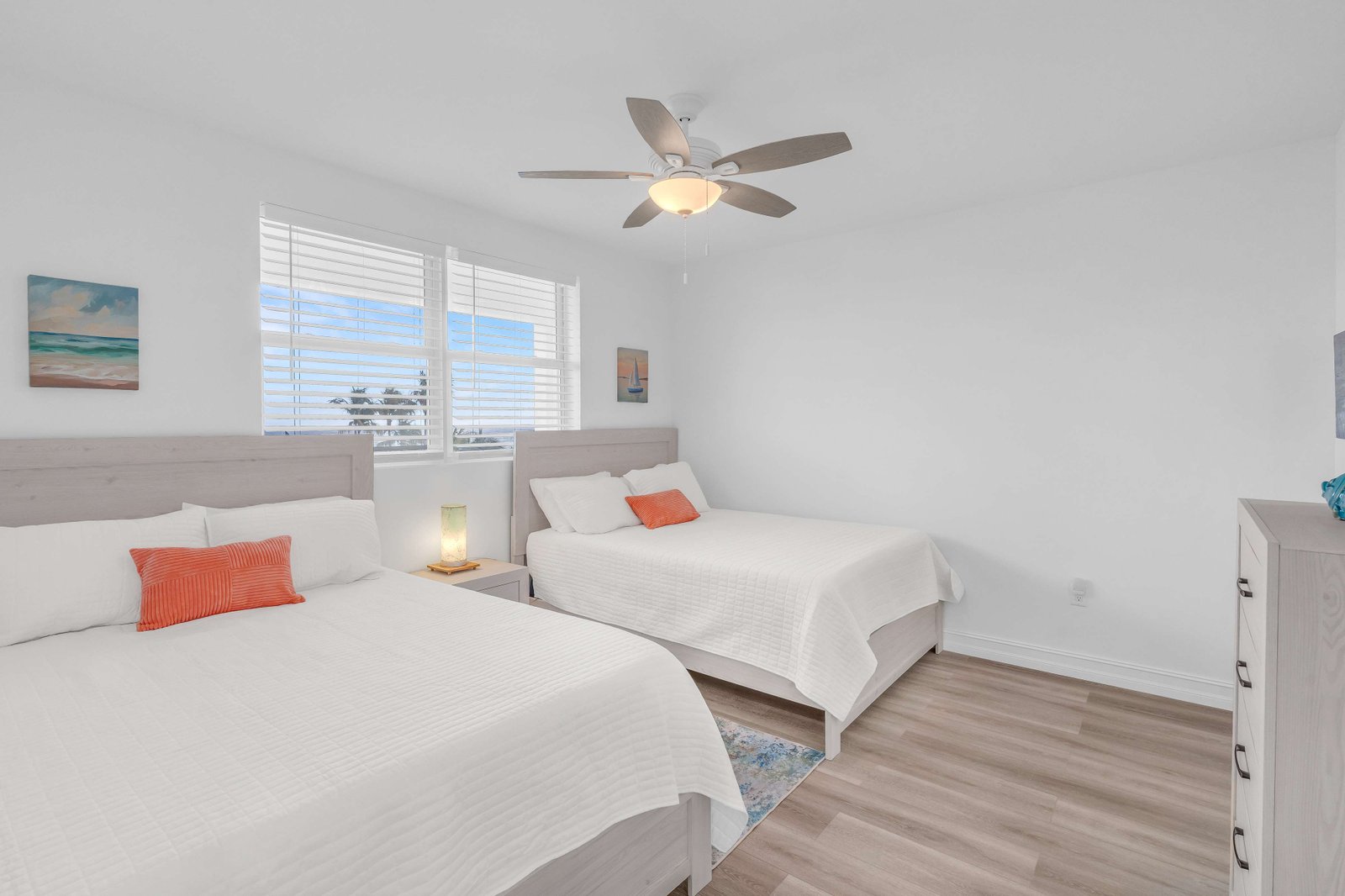 The condo features two comfortable bedrooms, each with its own private bathroom for added convenience and privacy. The primary bedroom, facing the beach and pool, offers a king-size bed, allowing you to relax while enjoying beautiful views. The second bedroom is perfect for families or groups, featuring two queen beds and its own private bathroom.