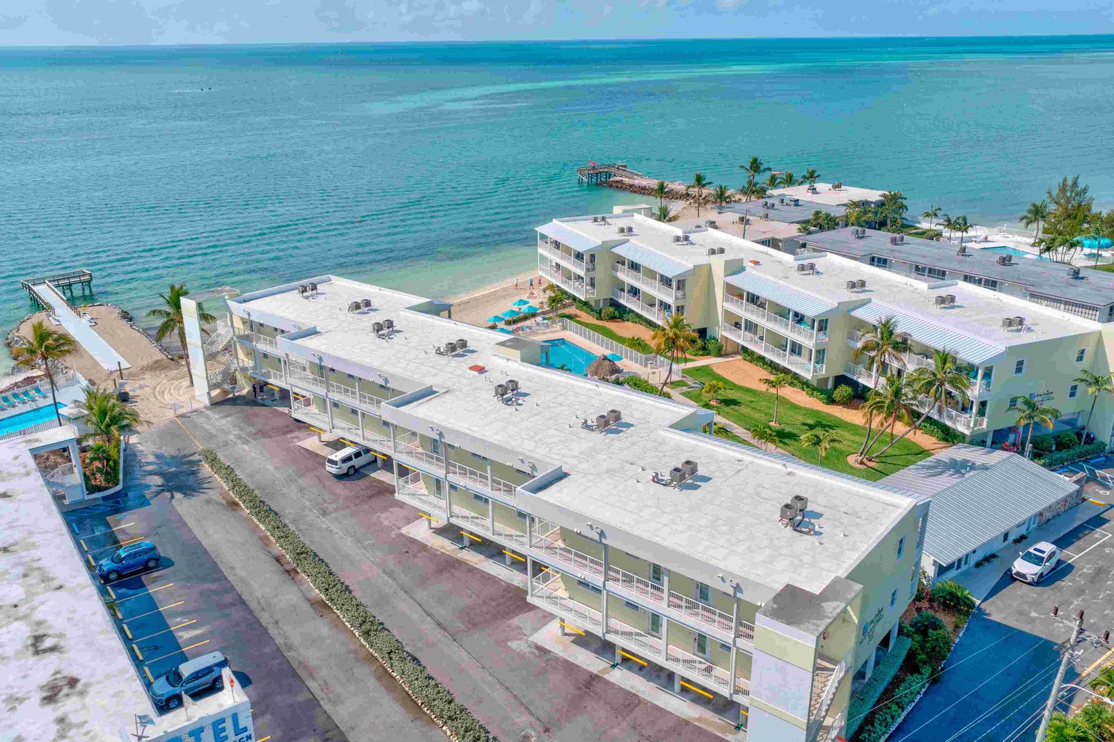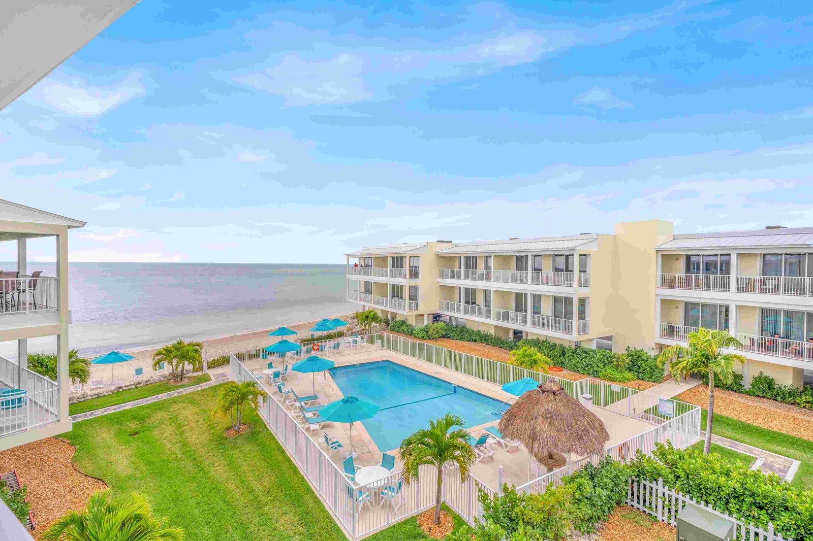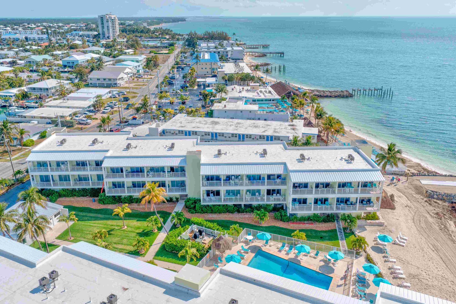 One of the standout features of this property is the brand-new pier, extending out into the water and offering breathtaking panoramic views. On both sides of each building, you’ll find charming tiki huts, ideal for relaxing in the shade, enjoying a drink, or gathering with friends and family while feeling the ocean breeze.